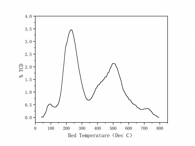 催化剂TPR实验从-130℃开始测试,实验结果表明其还原过程具有显著的分步还原特性:-112℃及-35℃两处出现低温还原峰,且-35℃的峰与96℃的强还原峰相连,后者为催化剂核心活性组分的主还原过程。