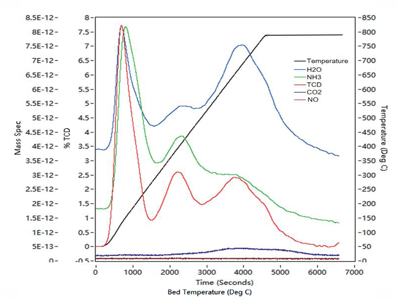 分子筛样品的NH3-TPD-MS质谱联用试验,低温下质谱检测NH3的曲线与TCD相同,500℃以上TCD的峰是因为分子筛样品高温缩合脱水反应。
