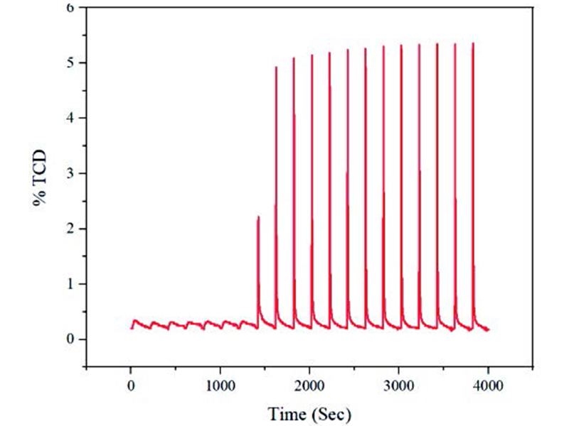 Pt/Al2O3催化剂的CO脉冲化学吸附的表征结果表明多次脉冲被完全吸附,证明该催化剂具有相当数量的表面Pt原子能够化学吸附CO分子,其具有良好的金属分散度。